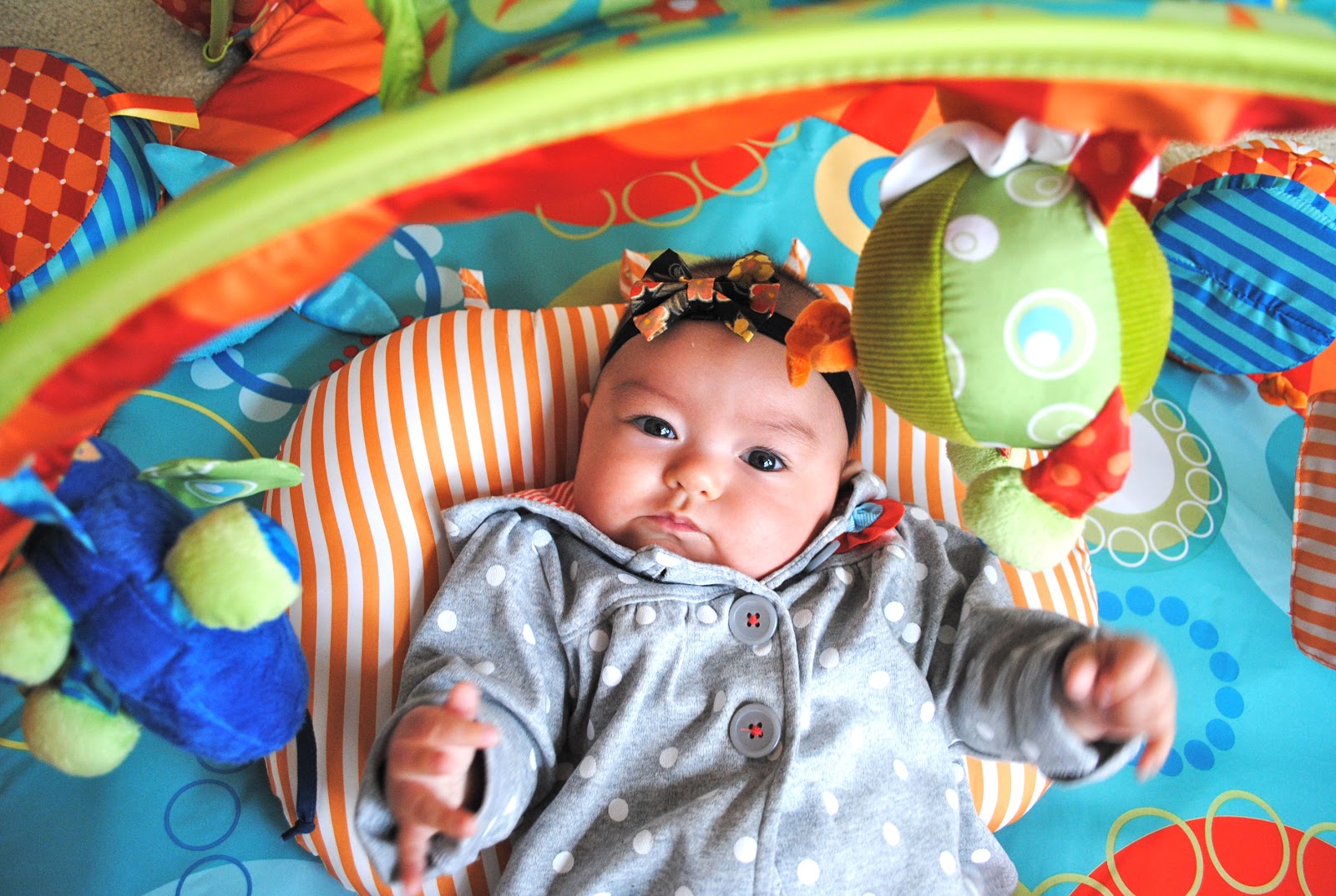 She is becoming more and more aware each and every day. She is even starting to enjoy her play mat.